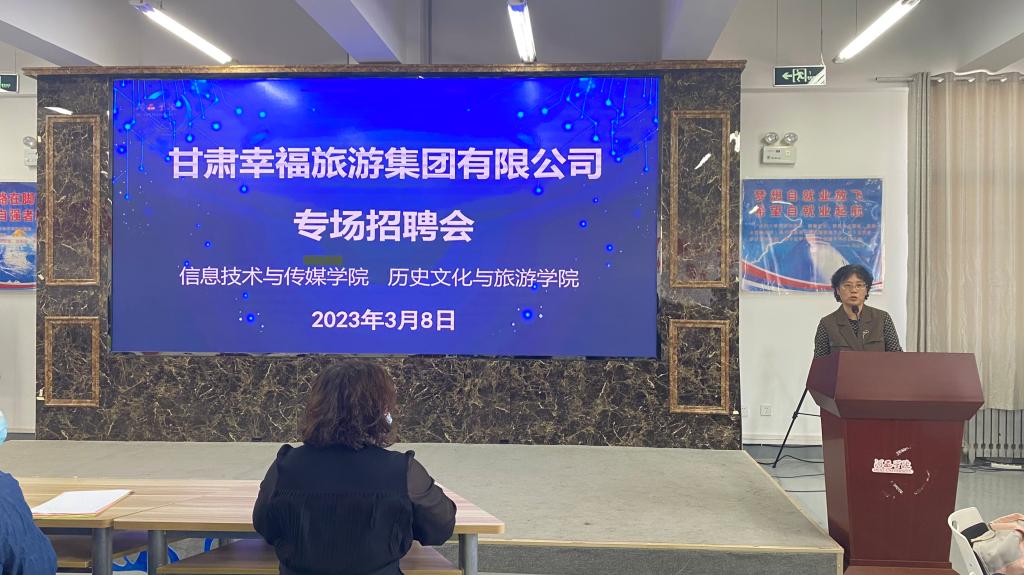 招聘会上,信息技术与传媒公司党委负责人对甘肃幸福旅游集团有限公司来校招聘表示热烈欢迎并鼓励同学们树立正确的择业观,做好长远职业规划,引导他们理性看待就业形势,把握政策导向,转变就业观念。
